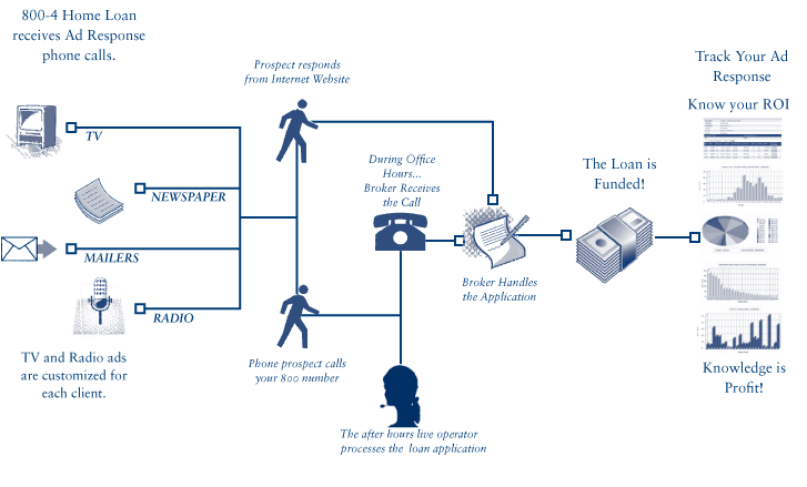 Our process is simple and straight forward. We provide tools for the generation of leads through mortgage Vanity toll-free telephone numbers with matching websites, television commericals, and radio advertisements. Responses from the internet and telephone enable you to efficiently generate leads. Our software allows a thorough review of the exact source of leads by using real-time charts, graphs, and analysis of expenses. This process allows a comprehensive review of cash flow and ROI.